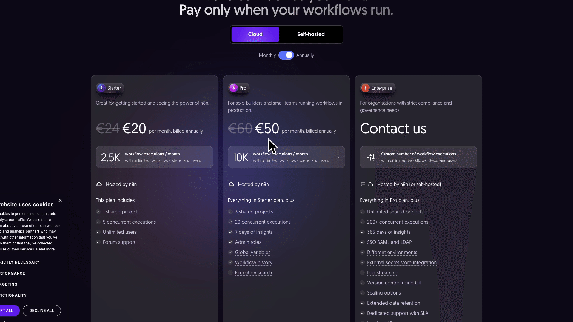 n8nには複数の料金プランが用意されており、用途に応じて選択できます。